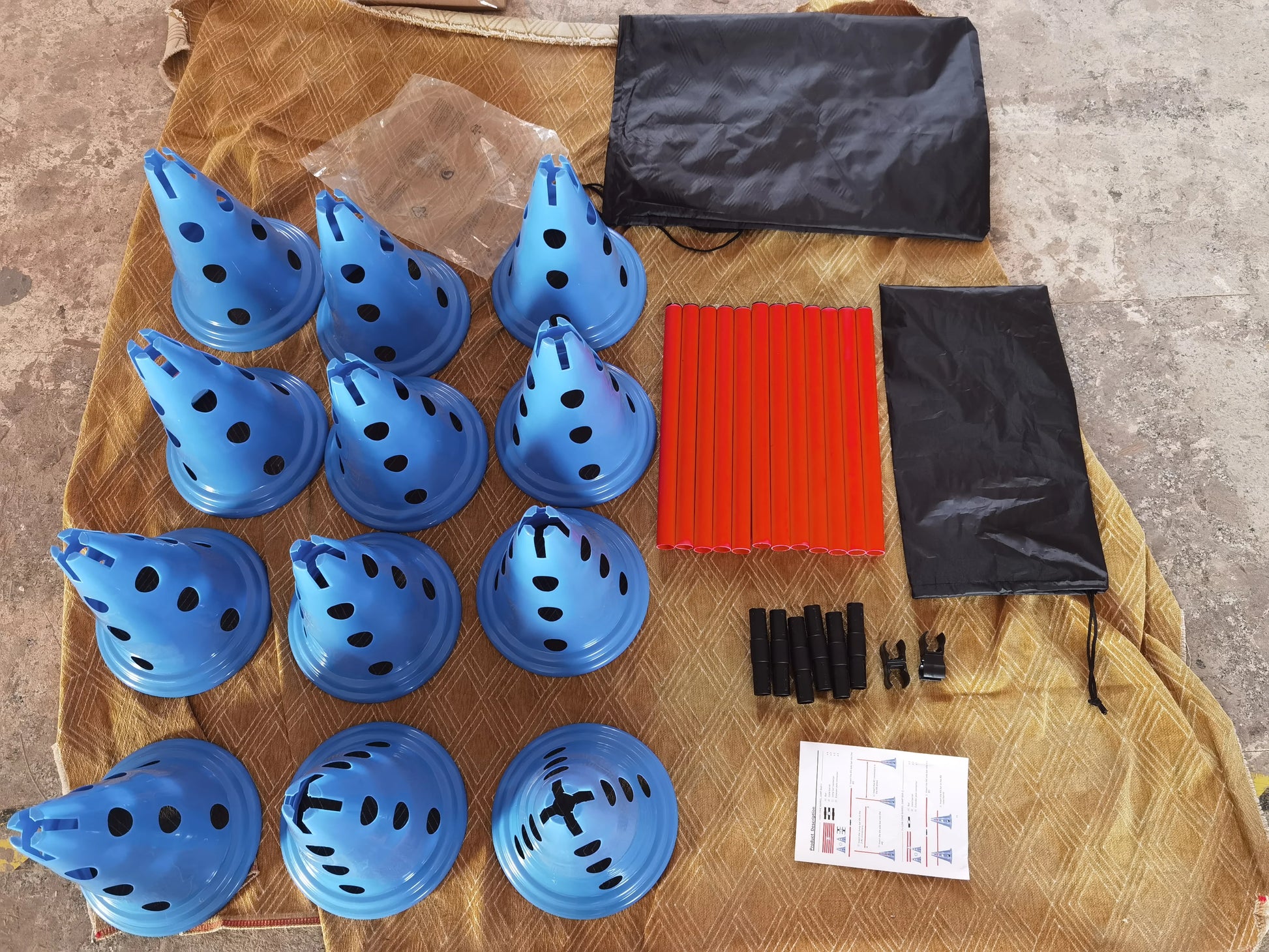 - Includes 12 cones and 6 poles to create endless obstacle layouts for progressive training, suitable for indoor or outdoor use.